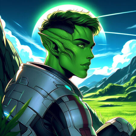 Hailing from the verdant planet Vir'da, the Arion are an ancient race of rational, logical beings with advanced technology and an insatiable curiosity about the universe. With smooth mint to emerald skin tones and pointed ears, these tall, slender aliens have evolved to blend into the dense foliage of their homeworld. Reproducing through self-fertilization, Arion form close communal groups to raise their young without concept of gender or family units.Physiology: They have smooth green skin, ranging from light mint to deep emerald in tone. Their faces appear human-like but with subtle differences like pointed ears, bright green eyes, and ridged nostrils. They are tall and slender, with lean muscle mass. Reproduction happens through self-fertilization - they only require their own DNA to procreate.Homeworld: They hail from a planet with a dense, jungle-like environment. The abundance of plant life and green vegetation on their world led to the green pigmentation in their skin to camouflage and absorb sunlight filtered through canopy leaves. Their planet has lower gravity compared to Earth, allowing them to evolve tall, lithe frames.Culture: With no females, their society is structured around fertilized males bearing offspring. They form close familial bonds in small, intimate groups. The young are raised collaboratively. Their language relies on melodic hums, trills and whistles. Their clothing is minimal, simple tunics and trousers in earthy tones.Technology: They are highly intelligent and technologically advanced. Their sleek ships allow interplanetary travel and exploration. They seek out new worlds and sentient life with curiosity and logic, eager to gain knowledge.